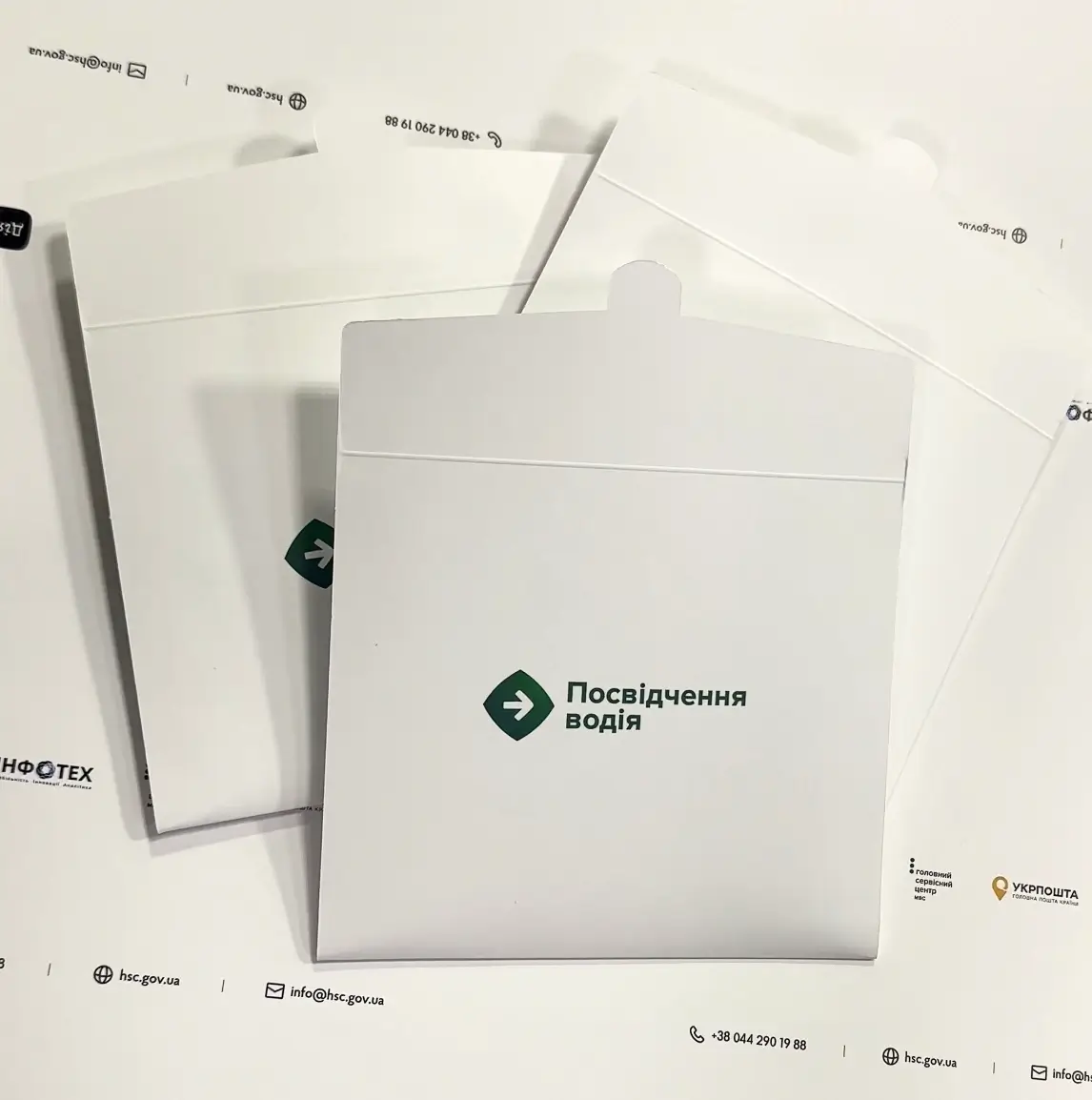 - Формати: С6 (114×162 мм), DL (110×220 мм), С5 (162×229 мм), С4 (229×324 мм), індивідуальні